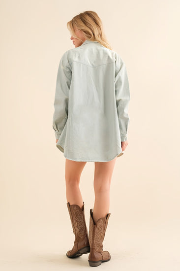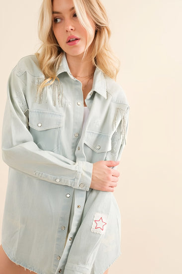 Garment washer star rhinestone fringe embellished pocket front snap up boyfriend fit denim jacket